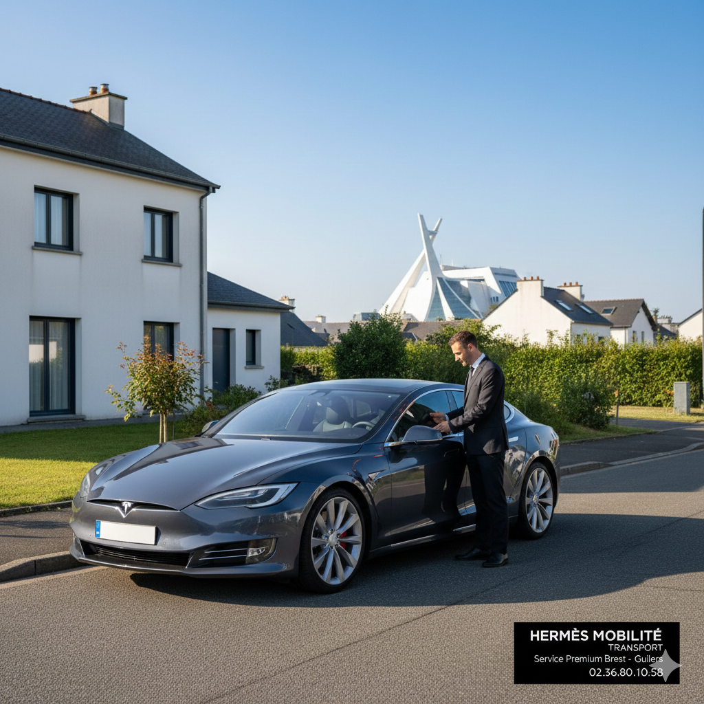 La Tesla : Un bureau mobile entre Guilers et Brest Hermès Mobilité Transport propose une expérience qui dépasse le simple trajet. Pour un ingénieur se rendant au Technopôle ou un officier rejoignant son affectation, le silence d’une Tesla offre un moment de décompression rare. Nos véhicules, par leur sobriété et leur élégance, s'intègrent parfaitement aux attentes d'une clientèle qui recherche la confidentialité et l'efficacité.